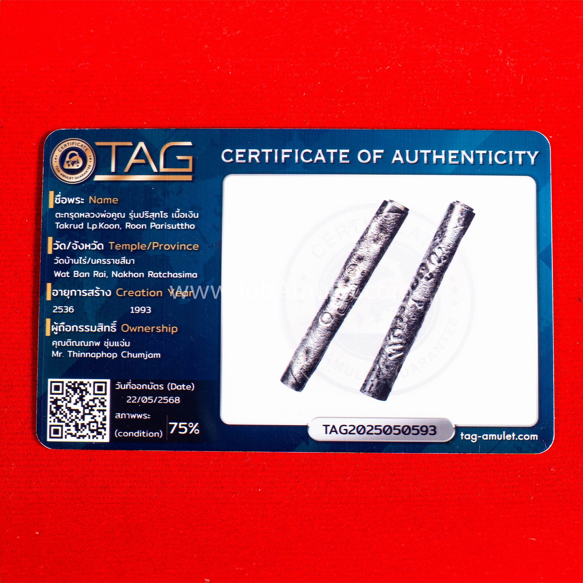 ตะกรุดเงินหลวงพ่อคูณ ปี 2536 พร้อมเลี่ยมกรอบทองคำแท้ (กรอบแพง) มีบัตรรับรอง
