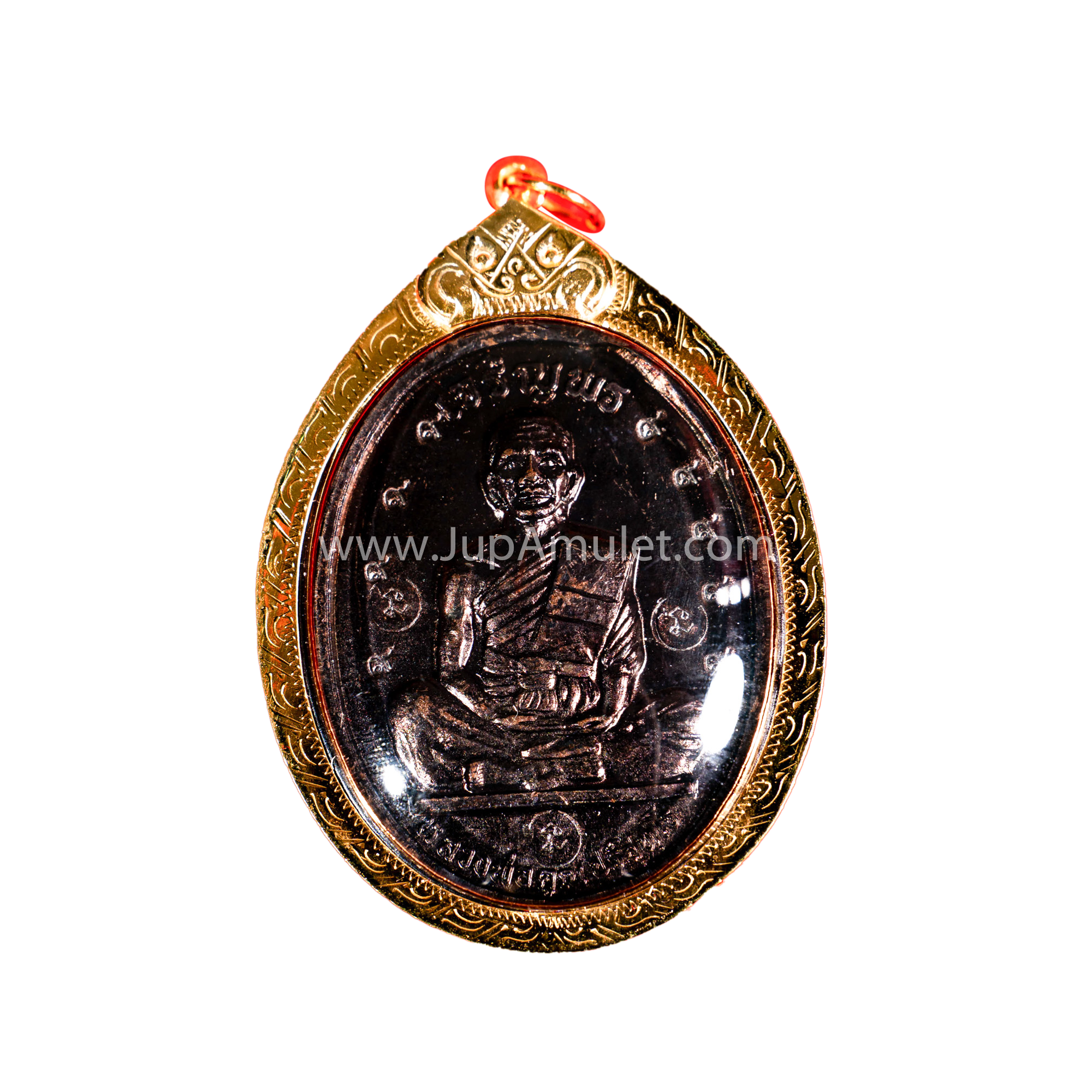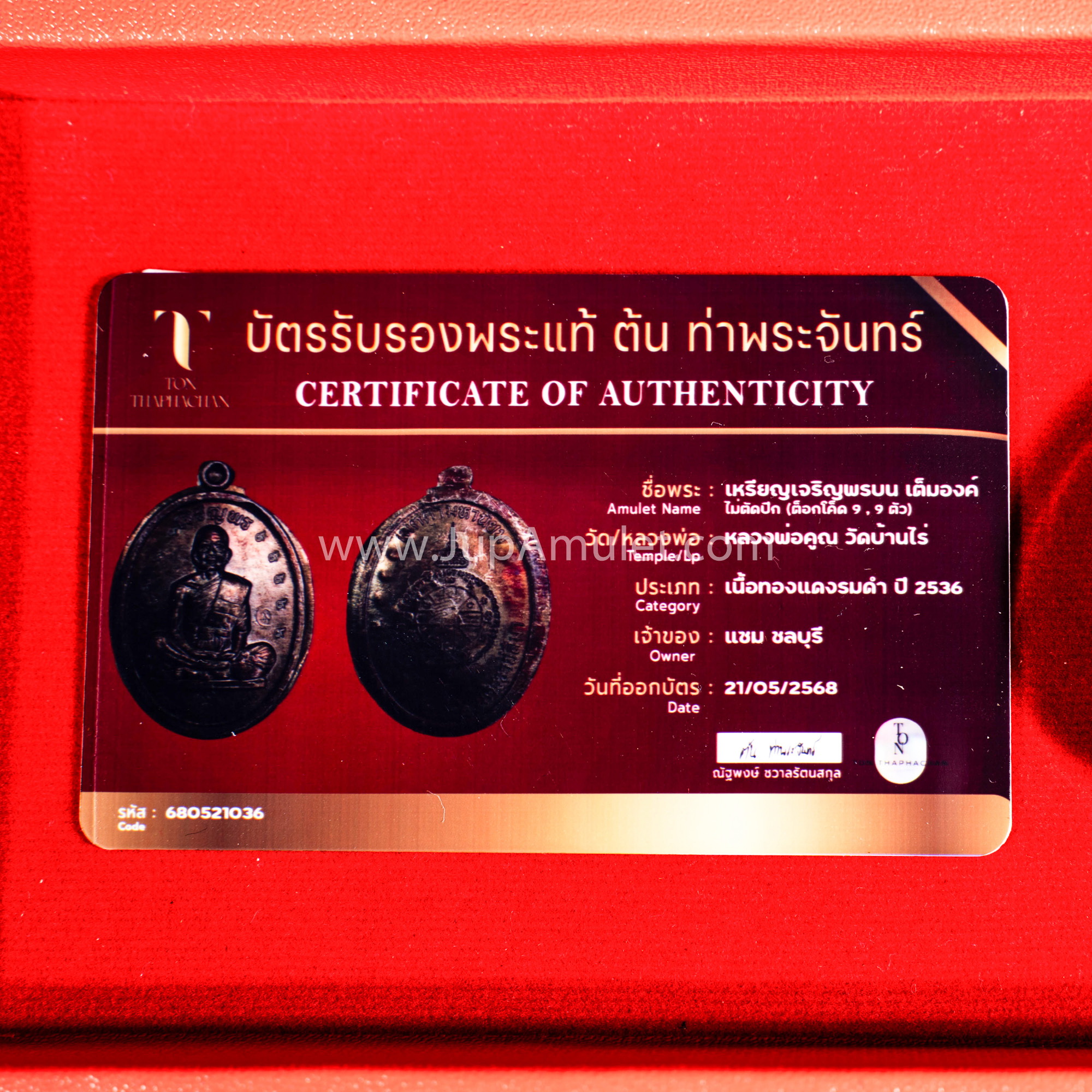 หลวงพ่อคูณ รุ่นเจริญพรบน เต็มองค์ ปี 2536 เนื้อทองแดงรมดำ พร้อมเลี่ยมกรอบทองคำแท้ ธรรมดา มีบัตรรับรอง
