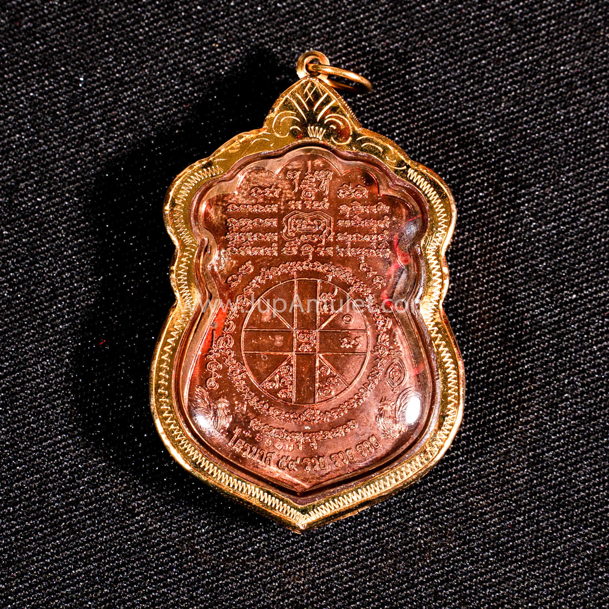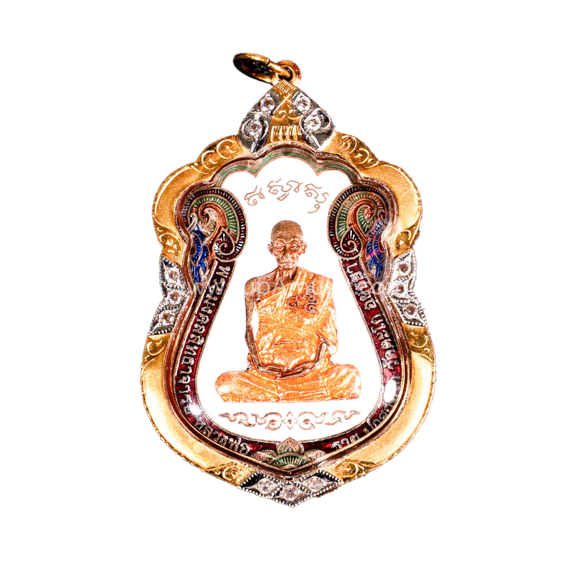 หลวงพ่อรวย รุ่นไตรมาสกรรมการ ปี 2559 เนื้อทองแดง ลงยาขาว พร้อมเลี่ยมกรอบทองคำแท้ ฝังเพชร CZ